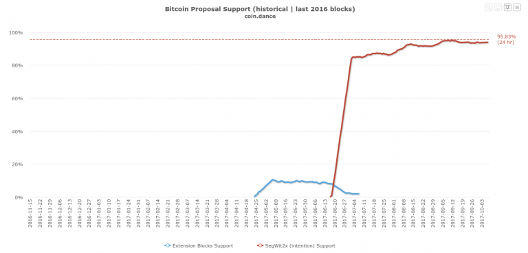 More than 93% of miners, very close to the 95% threshold usually considered unanimous for protocol upgrades, are currently supporting segwit2x as shown by their mined blocks. That includes previously…